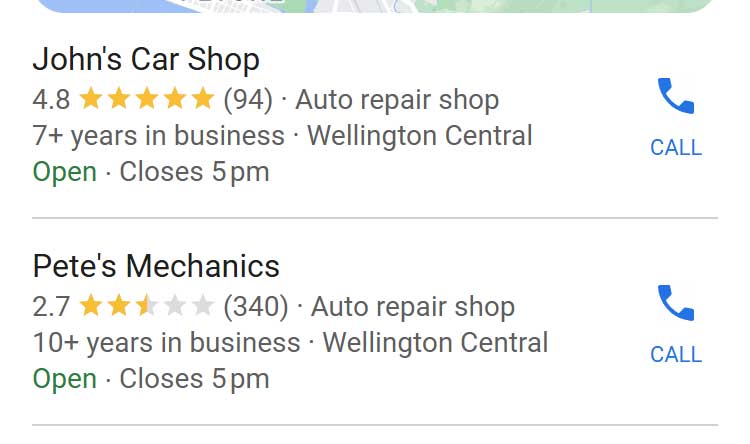 Google places a huge weight on how popular a business is when deciding how high to show it in the search results. If you don’t have a bunch of glowing reviews you’re being hit twice – you’re far less likely to show up in the results, and if you do, you’re far less likely to be picked.